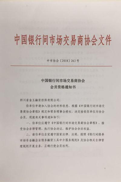 近日,金玉担保收到《中国银行间市场交易商协会会员资格通知书》,正式成为中国银行间市场交易商协会会员。这是金玉担保在拓展投融资担保业务上又一新的突破。 至此,金玉担保正式成为了交易商协会全国13家信用增进机构之一,有助于对交易商协会会员发行的银行间债券市场非金融企业债务融资工具提供信用增进服务,包括且不限于短期融资券(CP)、中期票据(MTN)、定向债务融资工具(PPN)等,丰富了公司债券担保金融产品,为资本市场提供深度担保服务打下了坚实的基础。 经国务院同意、民政部批准,中国银行间市场交易商协会于2007年9月3日成立,为全国性的非营利性社会团体法人,其业务主管部门为中国人民银行。协会单位会员涵盖政策性银行、商业银行、信用社、保险公司、证券公司、信托公司、投资基金、财务公司、信用评级公司、大中型工商企业等各类金融机构和非金融机构。 |