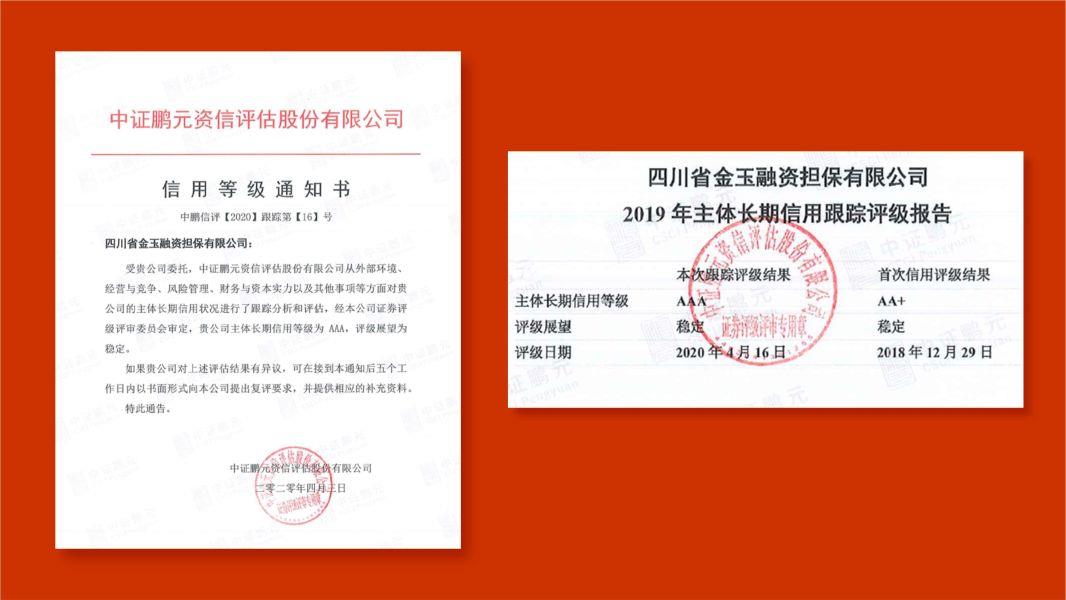 近日,金玉担保收到中证鹏元资信评估股份有限公司(简称“中证鹏元”)AAA主体信用等级通知书。4月16日,中证鹏元对金玉担保主体长期信用的2019年度跟踪评级结果上调为AAA,评级展望稳定。这是继今年1月,公司获得大公国际资信评估有限公司AAA主体信用等级之后,再次获得权威评级机构的肯定。 自2017年底增资以来,公司积极调结构促转型,主动开拓资本市场,债项担保业务实现稳步发展,综合实力得到不断提升。2020年1月,公司主体信用级别提升至AAA,意味着金玉担保正式跻身全国担保行业“第一梯队”。 截至目前,金玉担保已获得两家主流信用评级机构评定的AAA主体信用等级,体现了权威评级机构、资本市场对于金玉担保的高度认可,对公司发展具有重要意义,有利于公司进一步增强资本市场议价能力,扩大品牌影响力,为公司高质量发展注入强大的新动能。下一步,金玉担保将积极发挥主体信用AAA等级优势,深耕担保领域,厚植发展优势,探索产融结合模式,提升金融服务质效,为助力地方经济可持续发展作出积极贡献,彰显国有企业的责任与担当。 (金玉担保供稿) |